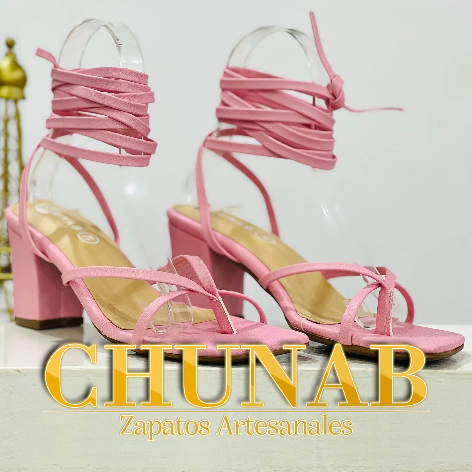 Zapatillas con diseño de pata de gallo con una tira atravesada para los dedos, para el talón incluye tiras largas para amarrar en la pierna. Tacón de 7cm de altura.